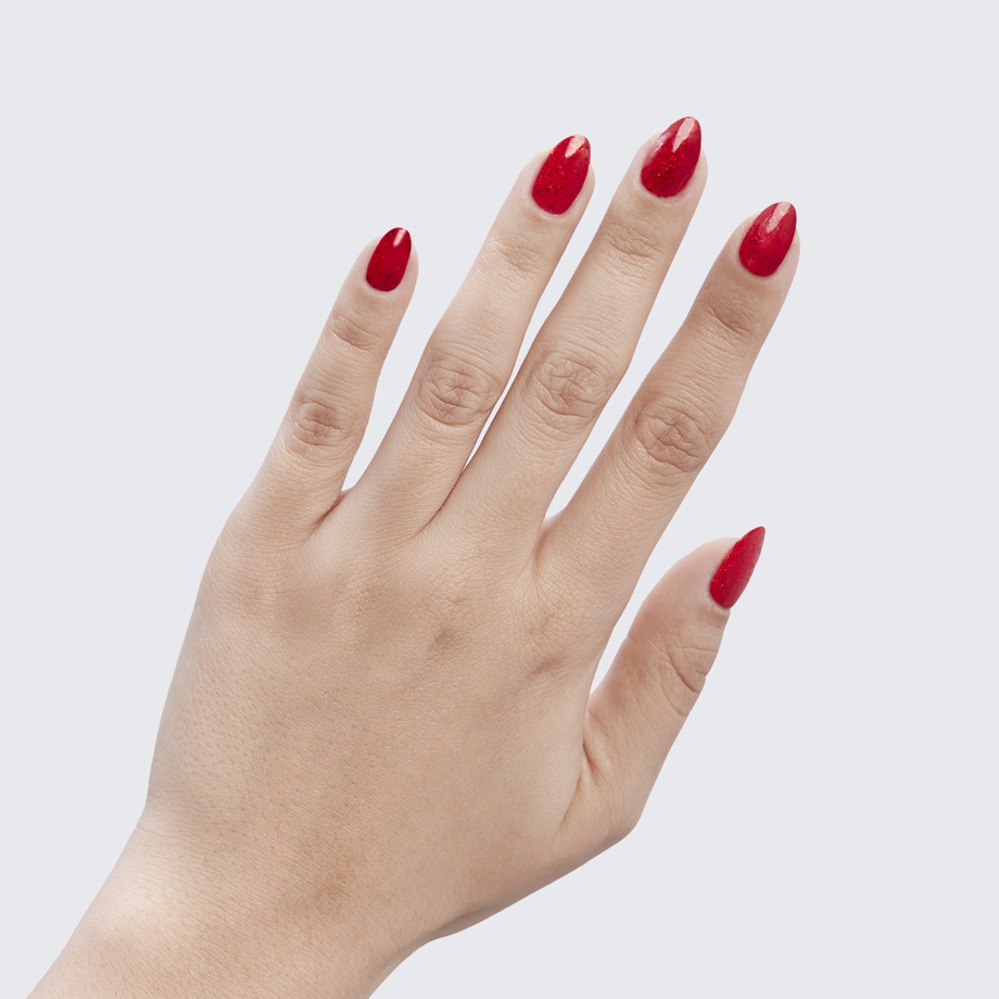 Classic red. Sparkles. Opaque. Cool undertone.